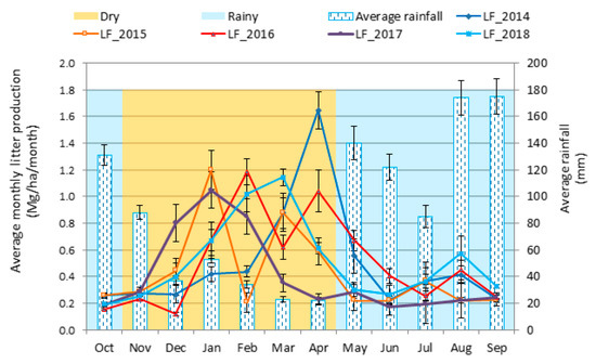 Average monthly litterfall production in each study year and average monthly precipitation over the study period. The blue shading corresponds to the rainy season and the peach shading to the dry season. Vertical bars lines denote ± 95% confidence intervals.