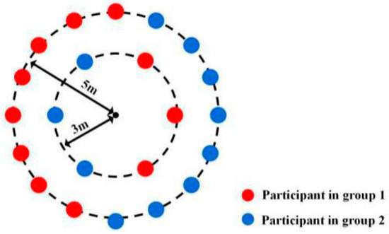 The trained participants were divided into two groups, each with eleven participants. These groups were exposed to the soundscape and lightscape at the observation sites for five minutes, then they filled out questionnaires and repeated above process at each site. During the odd number of repetitions, the first group opened their eyes and the second group closed their eyes; subsequently, the even number of repetitions had the first group close their eyes and the second group open their eyes. Each group repeated the process three times at each site and given time period, six times in total. Figure 2 presents the average size of the group and the overall setting.