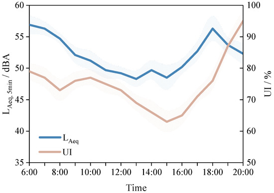LAeq,5min and UI values reflected the condition of sound and light environment in urban forests (see Figure 3). This showed two different tendencies between LAeq,5min and UI, including a similar trend and an opposite trend before and after 18:00, respectively. There was reduction in biological activities, but rise in UI after 18:00, because of decreased illuminance leading to the continuous decrease of illumination variation. Birdsong and the sounds of human activity, especially traffic noise, formed the peak of LAeq,5min in the morning and at dusk, which suggests that daily biological activities are significant drivers for soundscapes in urban forests [15,57]. Variations of illumination impacted the comparison of light and shadow, which when relates to the UI, which reached a maximum in the afternoon and a minimum in the morning and dusk [58]. Thus, UI reached extreme values at these periods. Vegetarian and plant structures are potential drivers that may affect lightscape in urban forests, contributing to shadows checkering with sunlight and shade throughout the day [59,60].