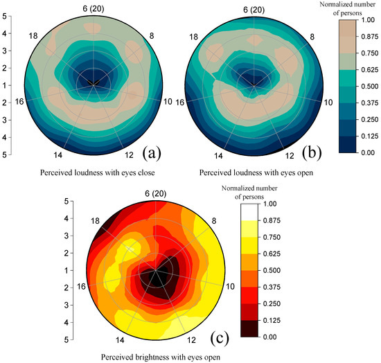 Distribution of the perceived loudness with eye (a) closure and (b) opening, and (c) the distribution of perceived brightness with eyes open from 6:00 to 20:00.
