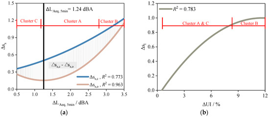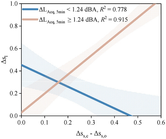 When ΔLAeq,5min was 1.24 dBA, opposite trends of Δss,c − Δss,o were determined; therefore, when ΔLAeq,5min exceeded or was below 1.24 dBA, there were different trends of Δsl. Figure 7 shows the relationship between Δss,c − Δss,o and Δsl, including their confidence intervals (blue and pink areas). There was a positive trend when ΔLAeq,5min was more than 1.24 dBA, and a negative trend when ΔLAeq,5min was less than 1.24 dBA. After data fitting and transformation, the equations that show the relationship between Δss,c, Δss,o, and Δsl were obtained as follows: