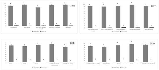 Percentage mortality of PPM larvae (±SEM) recorded inside the nests collected in treated and control plots after applications of Bacillus thuringiensis var. kurstaki in 2016–2019. Bars with different letters are significantly different, according to the paired t-test (p < 0.05).
