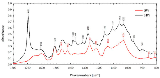 FTIR spectra of sapwood (SW) and heartwood (HW) waterlogged Scots pine wood corrected and normalized at a wavelength of 1510 cm−1.
