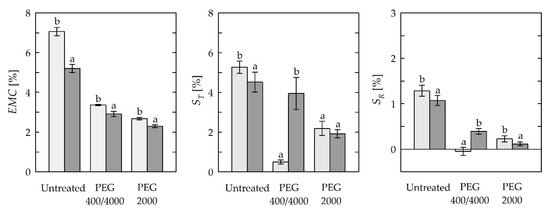 Comparison of the mean value of equilibrium moisture content (EMC) for RH = 44%, tangential (ST), and radial shrinkage (SR) of untreated and PEG-treated waterlogged Scots pine sapwood (SW) dried according to different approaches (gray and dark gray bar—multi-stage and single-stage (alternative) drying schedule, respectively; error bars denote ± standard deviation; identical superscripts (a, b) denote no significant difference (p < 0.05) between mean values according to post-hoc Tukey’s HSD test).