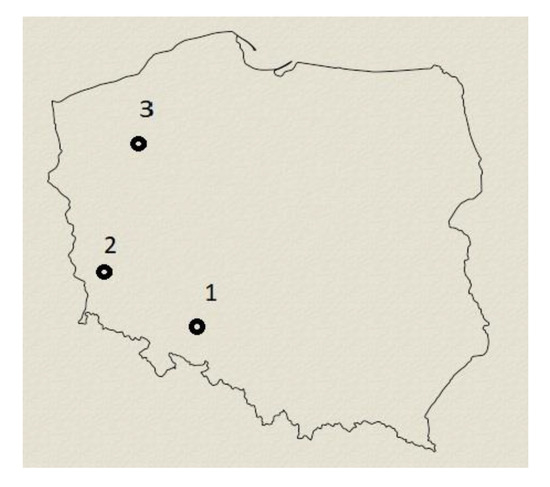 Location of research material collection sites: Site 1—Silesian Forestry Region; Site 2—Greater Poland–Pomerania Forestry Region; Site 3—Baltic Forestry Region.