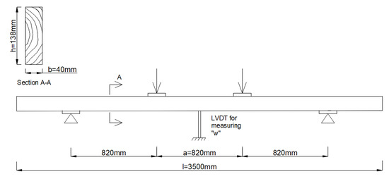 Static diagram of a four-point structural timber bending test to determine MOE and MOR in line with EN 408 [26]: w—deflection.