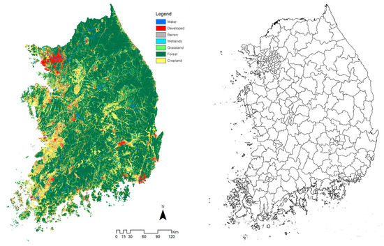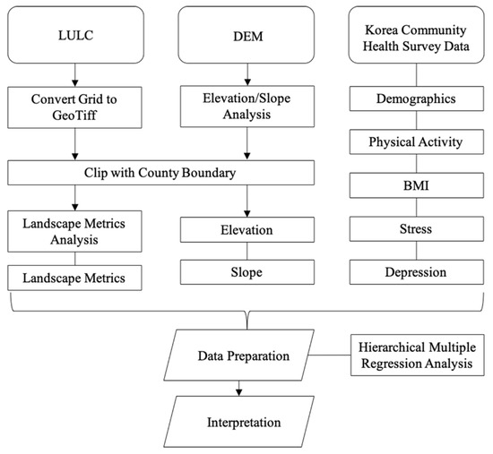Data used in this study included the Korea Community Health Survey (KCHS), Land Use Land Cover (LULC), a digital elevation model (DEM), and geographic information system (GIS) files including administrative boundary (Figure 2). The KCHS data were collected from Korea Centers for Disease Control and Prevention in 2016. The centers conduct a nationwide survey to provide data for planning, monitoring, and evaluating community health promotion and disease prevention programs.