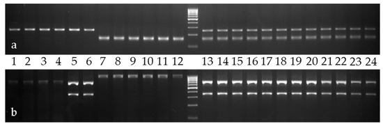 The results of win3 (a) and trnL/trnF (b) marker experiments with P. deltoides ssp. monilifera (1–4), P. deltoides ssp. deltoides (5,6), P. nigra (7–11), P.nigra var. italica (12) and P. × canadensis (13–24) samples. The marker of molecular weight has a 100 bp step. The numbers of samples correspond to Table S1.