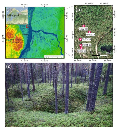 Study area (a) in the Pinega District, Arkhangelsk Region, Russia, N64.747°, E43.387°; (b) location of soil pits; (c) regular matrix of closed subsidence sinkholes in the karst landscape with Pinus sylvestris forest.