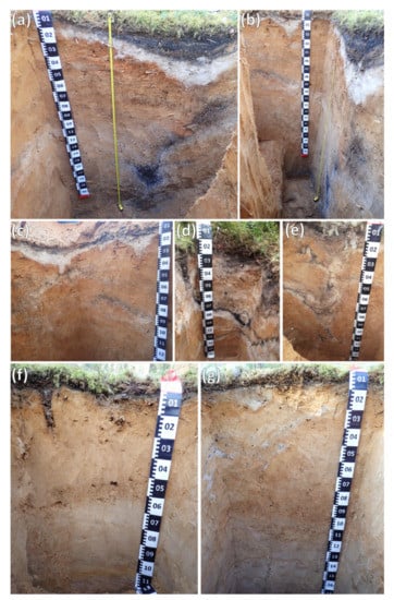 The soil pyrogenic archives comprised series of Podzols and Arenosols [] including those in burial state (Figure 2). Albic Podzol (Arenic) prevailed at the top of the soil sequences in the sinkhole traps. The buried soil material often contained individual buried profiles with the following horizon combination: AE(EA)-E-Bs(Bsh)-BC. Not every horizon from this sequence manifested in each buried profile, and often material of E and Bs horizons was mixed. During the field description, macrocharcoal particles demonstrated significantly higher abundances specifically in E horizons. Various signs of E, Bs and Bsh material in the form of discontinuous layers and clusters were also scattered through the bulk mineral mass that filled the sinkholes. Up to three charcoal layers were present in the litter horizons of the present-day surface. The central parts of sinkholes that are still draining the surface runoff contained the largest accumulations of buried charcoals in the form of bowls, wedges, and stripes (Figure 2a–e). The soils on residual surfaces between sinkholes (Figure 2f,g) contained only a few macrocharcoal assemblages, presumably due to the erosional processes that regularly removed charcoal. A substantial erosion impact was evident from the 2–3-fold difference in the total thickness of subsoil horizons at the high flats between sinkholes and at the central parts of sinkholes. The sequences of fluvial and glacial sediments started only from the depth of 55–95 cm at the high flats (Figure 2f,g), while in the sinkholes they were overlaid by a series of buried Podzols and Arenosols with a thickness of more than 200 cm. This indicates a long-term impact of denudation, along with the subsidence processes in this karst landscape, suggesting accumulation and denudation models of pedogenesis implemented at a very close distance.