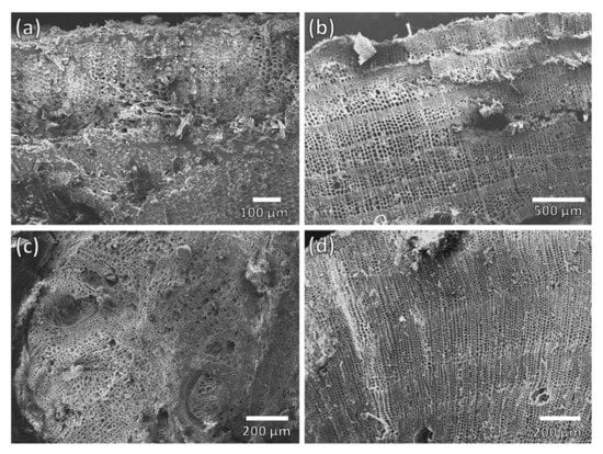 Charred plant fragments (scanning electron microscopy in a secondary electron mode): (a) tree bark, sinkhole Pin01-18C, depth 9–10 cm; (b) pine wood, sinkhole Pin01-18C, depth 30–33 cm; (c) tree root, sinkhole Pin01-18C, depth 71–90 cm; (d) pine wood, sinkhole Pin02-18, depth 111–112 cm.