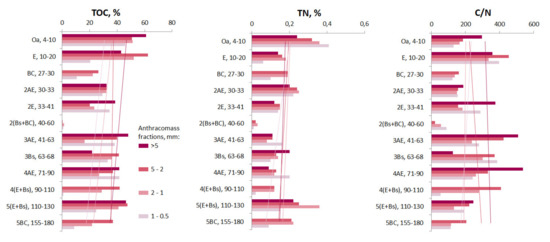 Our data indicate a significant long-term PyC sink in soils of the Pinega karst landscape. We found that a vertical distribution of C and N concentrations across the soil archives (individually for each charcoal fraction) is rather stable. Considering that the studied stratum covers ~10,000 years, this proves the high persistence of the anthracomass component in the soil PyC pool. Larger charcoal fractions (>5 and 5–2 mm), as well as individual massive charcoal pieces (8–24 mm) were more stable, as expected, but relatively small fractions (<1 mm) also maintained high TOC and TN concentrations. The C/N ratio did not display a pronounced tendency for decrease with depth within each fraction individually and turned out to be the most stable parameter in the anthracomass of a certain particle size.