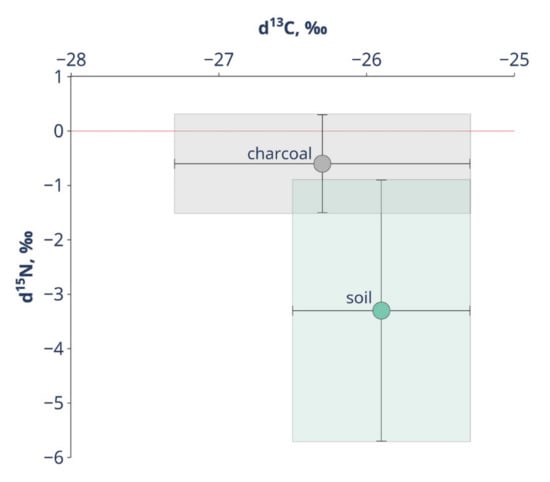 The estimates of carbon and nitrogen stable isotope ratios were obtained both in the anthracomass (pieces > 0.5 mm) and soil material (<2 mm) without anthracomass, all from the same layers. In contrast to C and N concentrations, the ratios of their stable isotopes varied to a lesser extent: δ13C = −26.3 ± 1.0‰ and δ15N = −0.6 ± 0.9‰ for anthracomass; δ13C = −25.9 ± 0.6‰ and δ15N = −3.3 ± 2.4 ‰ for soil material. The δ13C ranges plotted at means ± 1 standard deviation overlapped for soils and macrocharcoal, although the range for soil material was narrower (Figure 6). For the most part, the charcoal and soil material differed in δ15N values, which are sensitive to the high-temperature influence.