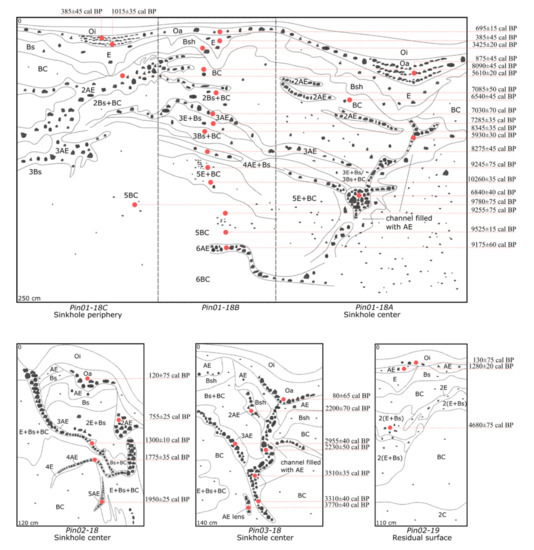 The shape and size of sinkholes strongly affected the deposition modes and rates (Figure 7), suggesting that the soil charcoal archives in sinkholes of various dimensions should be used as complementary proxies. The oldest date received (sinkhole Pin01-18, 10,260 ± 35 cal BP) was obtained from the macrocharcoal at the depth of only 140–160 cm, while the deeper layers (160–250 cm) of the same sinkhole contained younger charcoals of 9525 ± 15–9175 ± 60 cal BP. This inversion could not be explained by the “inbuilt age” effect alone, and turbations (e.g., translocation of mineral masses with the older charcoal from the periphery to the central channel of a sinkhole) are more likely reasons for such a large time discrepancy.