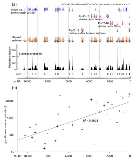 Complementary pyrogenic archives in sinkholes of various sizes: (a) probability distributions and medians (+) in a set of 37 radiocarbon determinations (macrocharcoal) and (b) charcoal concentration (specific anthracomass > 0.5 mm) vs. radiocarbon age of macrocharcoal.
