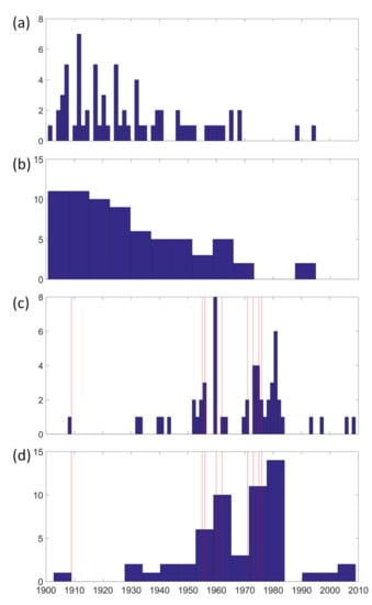 Dates of the first sampled tree rings, grouped by 1 year (a) and 5 years (b); dates of the fire scars grouped by 1 year (c) and 5 years (d). The number of trees is plotted along the vertical axis, and the red lines indicate the data obtained from the cross-sections, while the rest are from the cores.