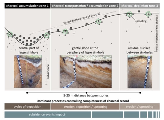 The morphology and stratigraphy (Figure 7) of horizons in the studied pyrogenic archives suggest three major drivers of charcoal burial: (a) paleo and active subsidence/drainage, (b) post-fire erosion/deposition, and (c) uprooting. The soil sequences in sinkholes demonstrate that erosion/deposition is a leading factor in assembling deep pyrogenic archives along topography patterns created by subsidence. This is enhanced by uprooting both during the post-fire disturbance episodes and during continuous tree falls at the stable phases between the fires. These driving forces of charcoal sinking discriminate between karst topography patterns and control the completeness of the macrocharcoal record in soils (Figure 10). The central part of sinkholes surrounding the draining channel comprise the charcoal accumulation zone 1, constrained by subsidence and deposition cycles; the slopes at the periphery of sinkholes represent charcoal transportation and accumulation zone 2, formed by subsidence, erosion-deposition, and uprooting; while high flats (residual surfaces) between sinkholes constitute charcoal depletion zone 3, controlled by erosion and uprooting. These zones alternate within 5–25 m distances and regularly replicate throughout this type of karst landscape.