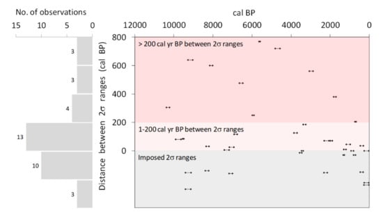 The “inbuilt age” effect could be significant, and the actual age of a fire may not occur within the 2σ confidence interval of a calibrated 14C age of charcoal []. So, to reliably distinguish between different fires, we also calculated the time distances between 2σ intervals (cal BP, 95.4% probability) for each 14C determination in a row of consecutive pyrogenic events.