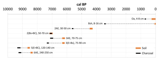 We compared the radiocarbon ages of organic carbon from soil material (<2 mm) with that of the anthracomass (>0.5 mm) from the same soil layer (Figure 12, Table S2). Although calibrated radiocarbon ranges (cal BP, 2σ, 95.4% probability) could coincide, in most cases 14C age for TOC from soil was significantly younger than for charcoal from the same layer. There are several possible explanations for this phenomenon. Firstly, the vertical migration of a younger organic matter along the profiles of buried soils in sinkholes, which reduces the estimate of age for soil material. For instance, the greatest discrepancy between the age of charcoal and soil from the same layer was found at a shallow Bsh horizon, which is formed by mutual precipitation of illuviated iron-and carbon-bearing compounds of a modern age. Secondly, the soil-charcoal discrepancy could be connected with the “inbuilt” radiocarbon age in charcoal, which, on the contrary, leads to the overestimation of age. Finally, older charcoal could be introduced into a younger layer by turbations, as well as eroded from soils on residual surfaces, where it was buried by uprooting long ago. These factors could act simultaneously and should be considered carefully when interpreting the data.