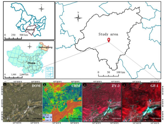 Location of the research area and multi-source remote sensing dataset (aerial orthophoto, LiDAR, ZY-3 and GF-1 WFV).