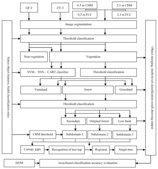 Multi-scale vegetation type classification must first establish a multi-level classification system. In this study, vegetation information was classified into four levels: the first layer was the vegetation and non-vegetation layer (L1); the second layer was divided into farmland and grassland and forest, called the vegetation type layer (L2); the third layer was divided into secondary forest and original forest, called the forest type (L3) and the fourth layer was canopy and the canopy gaps (L4). To complete multi-scale vegetation type extraction, the GEOBIA technique was used in this study. The main reasons are: (1) image objects can be created on multiple specific hierarchical spatial scales (for example, forest stands are composed of multiple canopy layers); (2) image objects can obtain many attributes (statistics, geometry and structure of objects); (3) GEOBIA technique can better imitate people’s perception of real-world objects; (4) image classification reduces the phenomenon of salt-and-pepper effect and (5) output (classification object) can be directly used for spatial analysis of geographic information systems. This study used eCognition Developer 8.7 (Trimble Germany GmbH, Munich, Germany) to develop a classification rule set and perform an object-oriented processing flow. The technical route is shown in Figure 2.