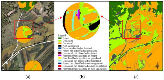 An example of accuracy evaluation of L2 layer according to the area-based method. (a) Reference vector polygon; (b) a validating multi-category graph generated by intersection operation and (c) final classification result of the vegetation type.