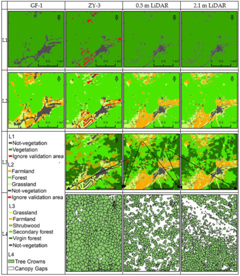 The optical classification images (GF-1 and ZY-3) were used to obtain better classification results on the L1 layer (vegetation non-vegetation layer), indicating that FDI could better identify all types of vegetation. NDVI has some saturation problems for vegetation identification and FDI is a good complement. LiDAR obtained better classification accuracy than optical data, indicating that the physical characteristics of vegetation (vegetation coverage) could provide more accurate information than spectral features, and was more effective for vegetation identification. In addition to the data source, image spatial resolution was the main factor that constrains the classification accuracy of this layer.