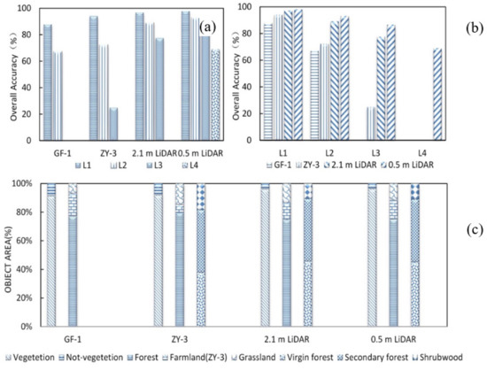 The resolution of remote sensing images and LiDAR data had an obvious impact on the classification results of this study. Classification results indicate that low-resolution data had some limitations in the ability to express vegetation features compared to high-resolution data. GF-1 imagery (16 m) and ZY-3 imagery (2.1 m) were able to distinguish vegetation types, while 0.5 m CHM was able to extract more detailed vegetation features on a single-tree. The low spatial resolution of the resulting mixed pixels results in poor spectral heterogeneity [53], which not only directly reduces the sensitivity of identifying complex objects but also the ability to extract small objects [54]. On the other hand, the information content that remote sensing images and LiDAR data can provide is also very different, especially in the detail level of vegetation characteristics. There were also differences in the proportion of different categories of different data on the different classes in the parent class (Figure 5c). It can be seen that the area ratio of the various types of area formed by LiDAR data and the area ratio of remote sensing image classification had changed significantly. However, the use of remote sensing data or LiDAR data of different resolutions yielded roughly the same area ratio. This result not only shows that the type of data source had a great influence on the classification accuracy, but also played an important role in the classification quantity characteristics.