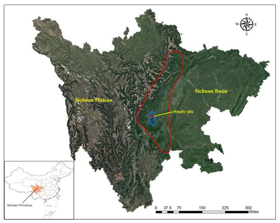 Location of the study site on the Google Satellite Map. The area within the solid red line is the rainy zone of Western China [34]. The area within the solid blue line is Yucheng County.