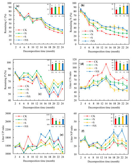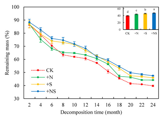 Remaining litter mass (% of the initial amount) during the decomposition process. Values are the averages of three plot replicates ± standard deviations. Different lowercase letters in the histogram denote significant differences between distinct treatments at the end of this study based on one-way ANOVA (p < 0.05; Fisher’s LSD test adjusted using the Bonferroni correction). CK, no added N or S; +N, added N but no added S; +S, added S but no added N; and +NS, added N and S.