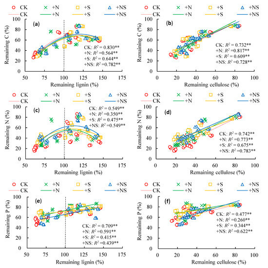 The remaining lignin correlated quadratically with the remaining C (R2 = 0.564–0.830; p < 0.01; Figure 5a) and N (R2 = 0.350–0.549; p < 0.01; Figure 5c), and the remaining lignin was positively and linearly related with the remaining P (R2 = 0.415–0.709; p < 0.01; Figure 5e). Furthermore, the remaining cellulose was positively and linearly correlated with the remaining C (R2 = 0.609–0.817; p < 0.01; Figure 5b), N (R2 = 0.675–0.783; p < 0.01; Figure 5d), and P (R2 = 0.260–0.622; p < 0.01; Figure 5f).