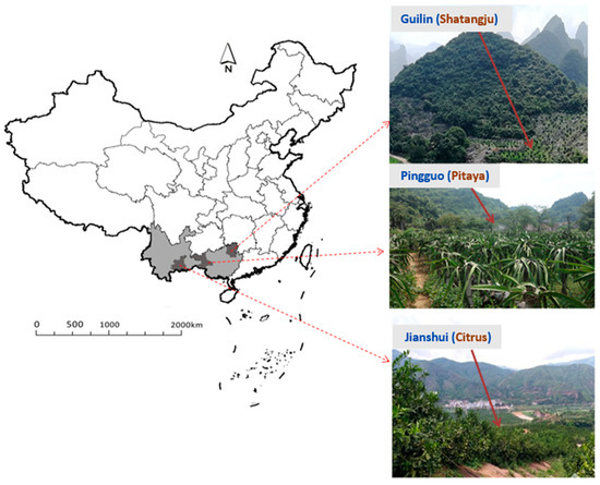 Three typical fruit plantations, including citrus (Citrus sinesis L. Osbeck), pitaya (Hylocereus undatus) and “Shatangju” (Citrus reticulata Blanco) plantations, were selected in three karst regions of southwest China (Figure 1). Adjacent forests were selected as the controls.