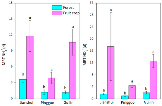 Figure 3. Mean residence time of NH4+ (MRT NH4+) and NO32212 (MRT NO3) in soils sampled from Jianshui (forest vs. citrus), Pingguo (forest vs. pitaya), and Guilin (forest vs. Shatangju) regions. Different letters for MRT NH4+ and MRT NO3 indicate significant differences (p < 0.05) between forest and fruit crop plantation in the same region.