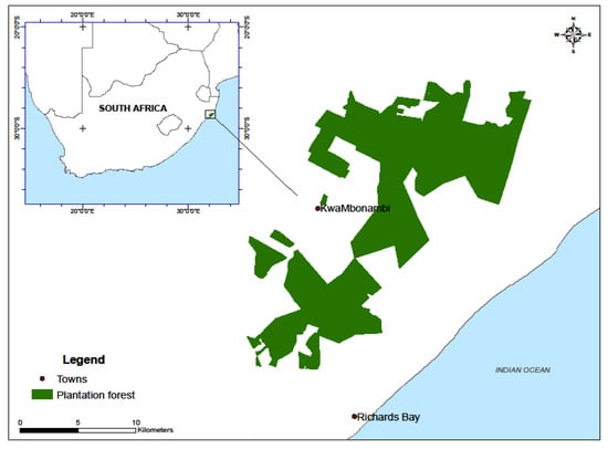 The study was performed in the KwaMbonambi plantation forests, which are located along the eastern seaboard of South Africa, 30 km northeast of Richards Bay (Figure 1). They are dominated by even-aged Eucalyptus plantations of almost 40,000 ha, which are managed by Sappi, a large South African pulp and paper company. This area is representative of frequently harvested forests and it provides an ideal testing location. The growing stock mainly comprises 6–14-year-old Eucalyptus grandis (E. grandis), E. grandis × Eucalyptus camaldulensis (E. gxc), and E. grandis × Eucalyptus urophylla (E. gxu) hybrid clones. The stands are fairly uniform regarding canopy cover with tree density established at 1667 trees ha–1. It is typical of the northern KwaZulu-Natal forestry region, which is subject to notable forest disturbances, such as fire and insect pest outbreaks. A subtropical climate characterizes the area, and the mean annual temperature is 22 °C []. The area receives an annual rainfall averaging 1200 mm, which is highly seasonal and peaks between November and February []; the potential evapotranspiration is 1772 mm per year []. The landscape of KwaMbonambi is flat and it consists of Quaternary alluvial sediments of clay sands of aeolian deposits [] and soil with varying levels of organic matter [], at mean elevation of 74 m above sea level. The high penetrability of the soils permits rapid leaching of soil nutrients due to the high rainfall in this region []. These conditions are favorable for fast-growing Eucalyptus plantations [].