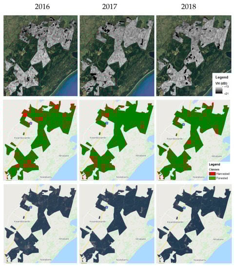The VH backscatter signals (top panels), Random Forest (RF) classification based on Sentinel-2 imagery (middle panels), and Sentinel-2 TrueColor (bottom panels) over KwaMbonambi forest (2016–2018) displaying harvested and forested compartments.