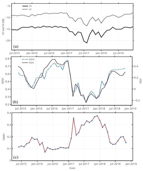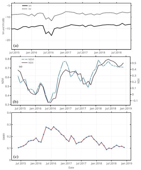 Monthly mean profiles of VH and VV backscatter (a), NDVI and NDII (b), and the SWIR1 (c) signals over harvested compartment in 2018.