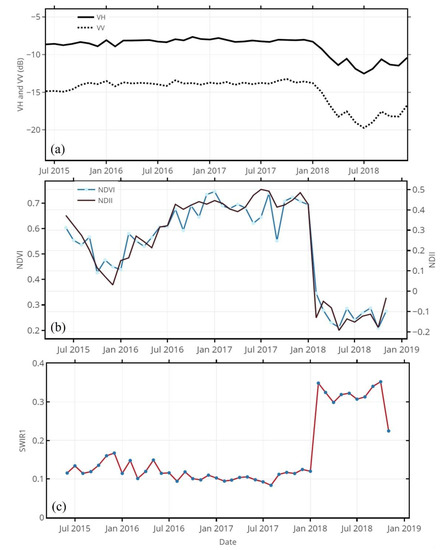 The pattern of VH and VV backscatter signals for the compartment that was harvested in 2018 was similar to that for 2016 and 2017 harvested compartments. The VH backscatter dropped from −13.81 dB in January 2018 to its lowest minimum (−19.82 dB) in July; the VV backscatter also declined, from −8.33 to −12.54 dB (Figure 5a). The NDVI value decreased from 0.72 to 0.21, whereas the NDII declined from 0.48 to −0.19 in the corresponding periods (Figure 5b). As expected, the SWIR1 increased from 0.11 to 0.34 over the time of the clear-cutting (Figure 5c).
