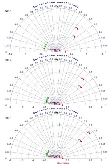 A Taylor diagram was exploited to establish the relationship between spectral indices and the Sentinel-1 backscatter signals. This is a single diagram that synchronously combines three statistical performance metrics: the Pearson correlation coefficient, root mean square difference (RMSD), and the standard deviation in a series of points on a polar plot []. The RMSD is a measure of the average error that is produced by a model and it is widely used to gauge overall model performance. However, it does not reveal the types or sources of the error, which would assist greatly in refining the models []. The RMSD is calculated as: