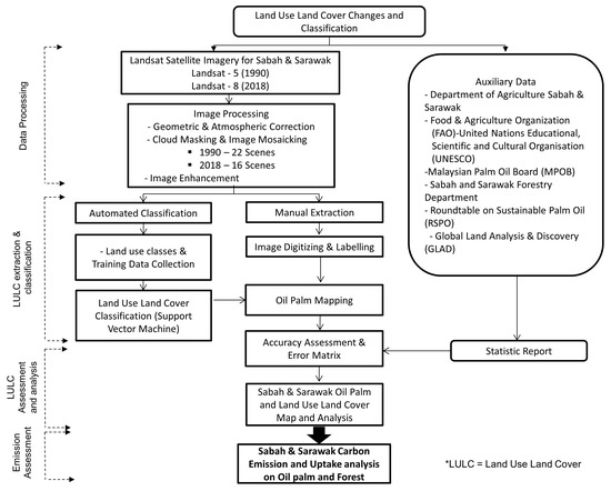 The LULC changes arising due to the palm oil industry expansion resulting in the conversion of forest and peatland have been repeatedly associated with deforestation and substantial carbon dioxide (CO2) emission from the burning of biomass [21]. In the past three decades, tropical peatlands have lost more than 2.5 gigaton carbon (Gt C) of carbon stock in total—of which 427.2 ± 90.7 Mg C ha−1 or 17.1 ± 3.6 Mg C ha−1 yr−1 was attributed to C loss resulting from biomass and peat due to the conversion of tropical virgin peat swamp forests into oil palm plantations [22]. Malaysia is the second-largest producer of oil palm in the world, and Sabah and Sarawak are the two largest oil palm producing regions in the country; however, there exists limited information on the extent and effects of forest and peatland loss driven by oil palm expansion. In addition, the CO2 emission from palm-driven land-use change is also poorly recorded in the Sabah and Sarawak regions. Most of the research has focused on global and national scales [23,24,25,26], thus ignoring the high degree of uncertainty in emissions existing at local levels. This study worked to provide such information by using multitemporal remote sensing analyses from 1990 to 2018 to quantify the loss of tropical forest and peatland through the expansion of oil palm plantations in Sabah and Sarawak, Malaysia, and then quantifying the rates of associated CO2 emission and uptake. This information is critical to motivate and support government efforts to sustainably manage these areas in the future.