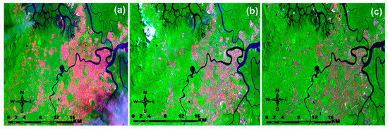 The phase of creating a seamless mosaic product from individual Landsat image; (a) Landsat-8 OLI, 10 June 2018; (b) Landsat-8 OLI, 18 June 2018; and (c) 2018 cloud-free Landsat Image over Kuching, Sarawak area.