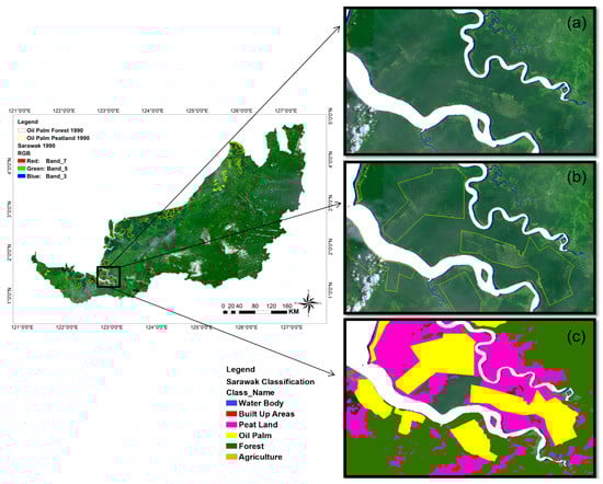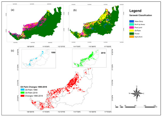 Sarawak oil palm development: (a) 1990 as the initial stat, (b) 2018, and (c) changes in oil palm development.