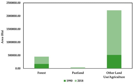In 1990, the expansion of Sarawak palm oil plantations was still far behind Sabah and Peninsular Malaysia; the state had around 366,799 ha of oil palm plantation area. Expansion of oil palm cultivation increased by 81% (increased by about 1.6 million ha) from 1990 to 2018. In 1990, the state had only 366,799 ha of oil palm plantation area, while in 2018 the oil palm plantation area rose to 1.9 million ha (Table 7). On the other hand, Sarawak has the largest forest land in Malaysia. In 1990, only 0.2% (635.6 ha) of total oil palm was planted in the forest area. However, within 28 years, the oil palm planted on forest land rose staggeringly by 14% (276,456 ha). Sarawak also has the largest area of peatland. The expansion of oil palm plantation area has occurred tremendously on peatland area compared to the oil palm on the forest. The coverage area of oil palm planted on peatland in 1990 was 197,323 ha (54%), which later increased to 657,273 ha (34%) by 2018. Besides, the greatest expansion of oil palm plantation area in Sarawak can be seen in the other land used (agriculture land). In 1990, there was 168,840 ha of oil palm planted on agricultural land, but the coverage area expanded to 990,891 ha in 2018 with an increase of 83% (Figure 5). Overall, within 28 years, oil palm cover has increased tremendously at the cost of 18% of forest and 30% of peatland (Figure 6).