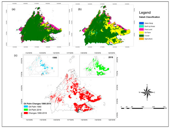 Sabah oil palm development: (a) 1990 as the initial state, (b) 2018, and (c) changes in oil palm development.