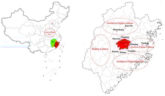 Fujian Province is located in the south of China (23°33′–28°20′ N latitude and 115°50′–120°40′ E longitude). Its geography is largely mountainous, but also has hills, plains, and coastal areas. About one-third of Fujian’s 39 million inhabitants live in rural areas. The strong influence of fengshui culture in this area can be demonstrated by the fact that most villages feature two fengshui forests on average and that 80.4% of the fengshui forests have not been damaged [40]. There are more village fengshui forests in the province’s mountainous areas than in its plains and coastal areas, and these are mainly located near a villages’ entrances, ancestral halls, and temples.