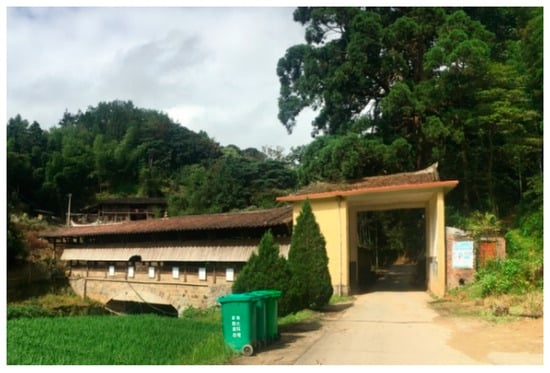 The second type of water tail fengshui forest combines fengshui forests, a corridor bridge, and/or a temple. The Hakka people deeply believe in that water must flow into and out of a village through a broad, heavenly entrance and a narrow earthen exit. In Dongshang Village, for example (Figure 3), where the Hakka culture is blended with the local culture of Youxi County, a fengshui forest and corridor bridge at the water tail creates a narrow earth exit, thus metaphorically preventing money from leaving the village too quickly. There is a canal on the far side of the bridge so that people can see the stream’s flow—this is the broad, heavenly entrance which symbolises the inflow of fortune from all directions.