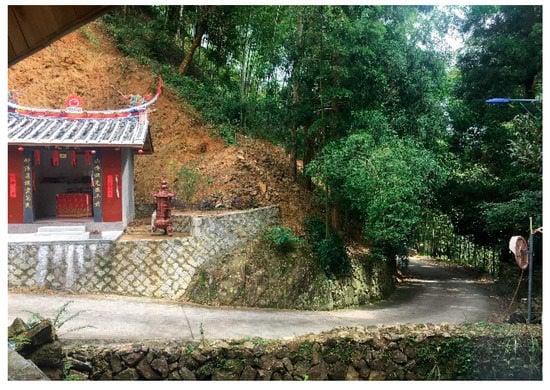 The third type of water tail fengshui forest combines forests with temples and other sites of polytheistic worship. In Figure 4, we see that not all sites are housed in temples—they sometimes feature memorial tablets in nature (usually under or near a famous or ancient tree). Here, the inhabitants of Lingtou Village placed open-air memorial tablets under the ancient Cryptomeria fortunei and built a temple for their earth god there. Figure 5 shows a more conventional site of worship—a temple in Kengtou Village, which was built next to a fengshui forest.