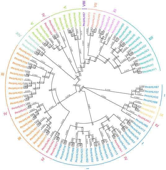 The Maximum likelihood (ML) method was used to construct a phylogenetic tree of 88 PmbHLH protein sequences from Masson pine. As shown in Figure 1, the 88 bHLH protein sequences were divided into ten large groups, including I, III, IV, V, VII, VIII, IX, XI, XII and XIV. The group with the largest number of PmbHLH proteins was I, with a total of 24 members, followed by III and XII. The group with the smallest number of PmbHLH proteins was VIII, with only one member. The long branch lengths of PmbHLH41, PmbHLH43, PmbHLH39, PmbHLH60 and PmbHLH62 indicate that they are quite different from other proteins. The high branch support values on the node indicate that the reliability of the phylogenetic tree is high. The bHLH transcription factor family has many members and the evolutionary model is complicated, which may result in low branch support values of the phylogenetic tree root. In addition, a phylogenetic tree constructed by 88 Masson pine bHLH protein sequences and 134 Arabidopsis bHLH protein sequences is provided in Supplementary File S4.