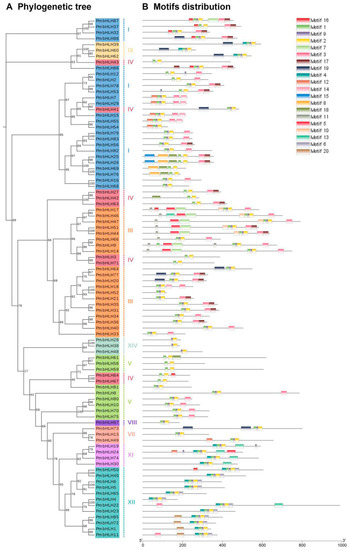Phylogenetic analysis and motif distribution of bHLH proteins in P. massoniana. (A) The phylogenetic tree constructed for 88 PmbHLH proteins. (B) The conserved motifs of each protein as identified by MEME. The 20 different colors represent 20 different conserved motifs.