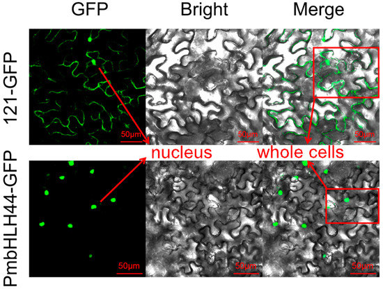 Subcellular localization assays of PmbHLH44 protein in tobacco leaf cells. Empty 121-GFP is localized in the whole cell, and 121-PmbHLH44-GEP is localized in the nucleus.