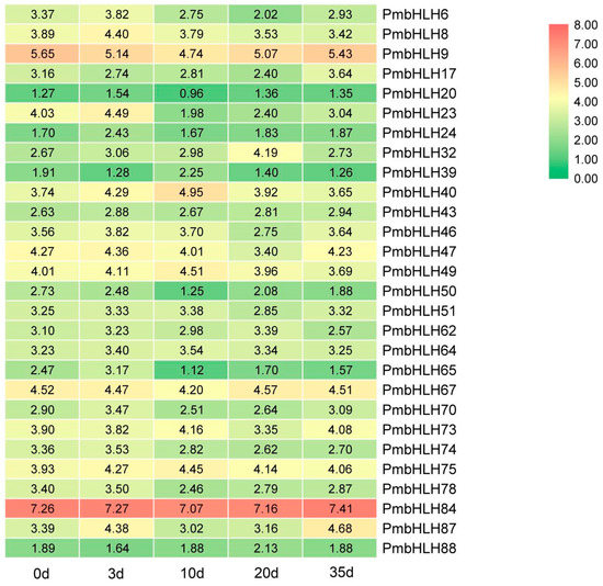 According to the pine wood nematode inoculation transcriptome data, heat maps were drawn (Figure 4). The heat map for the pine wood nematode inoculation transcriptome showed that the expression level of PmbHLH84 at 0–35 days was very high when compared with other genes longitudinally, while the expression levels of PmbHLH20, PmbHLH24, PmbHLH39, PmbHLH50, PmbHLH65 and PmbHLH88 continued to be very low at 0–35 days, and the expression levels of the remaining genes were intermediate. In general, the horizontal expression levels of these genes tended to first increase, then decrease and then increase. The expression levels of PmbHLH genes varied, indicating that these genes each have specific functions in specific environments.
